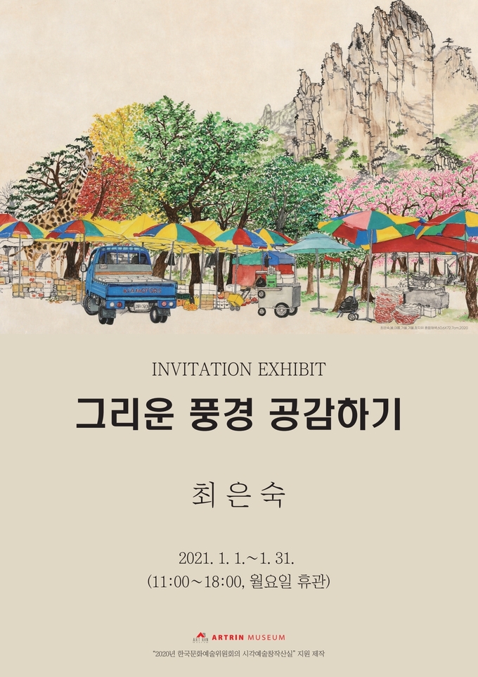 아트린뮤지움(Art Rin Museum)은 2021년의 첫 번째 전시로 최은숙 작가의 ‘그리운 풍경 공감하기’ 를 개최하여 지난 1월 1일(금)부터 전시를 하고 있다. 아트린뮤지움의 이번 초대 전시는 1월 31일(일)까지 아트린뮤지움 제1전시실에서 무료로 관람할 수 있다.