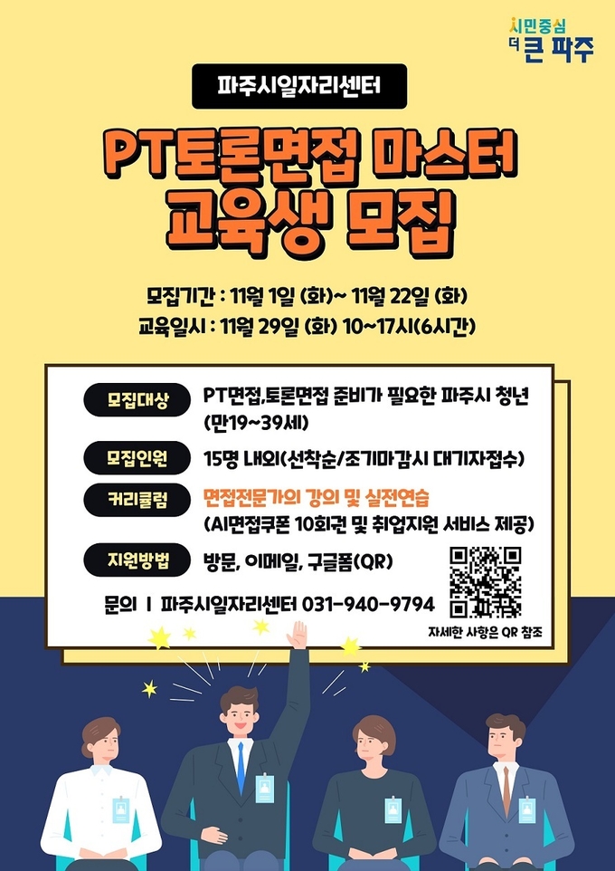 파주시(시장 김경일)는 11월 1일부터 22일까지 ’PT·토론 면접 마스터 프로그램‘의 참여자 15명을 선착순으로 모집한다.