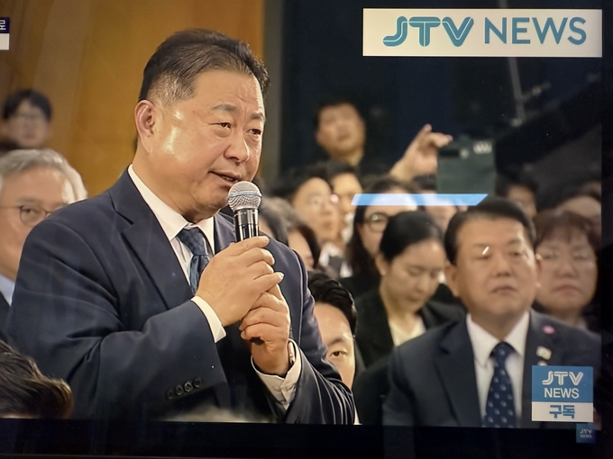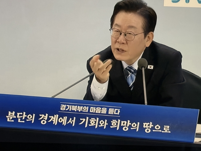 김경일 파주시장이 14일 경기 북부 미군 반환 공여지 개발 문제를 비롯한 지역 발전 방안을 토론하는 타운홀 미팅에서 이재명 대통령에게 대추벌 성매매집결지 폐쇄 지원을 요청했다.
