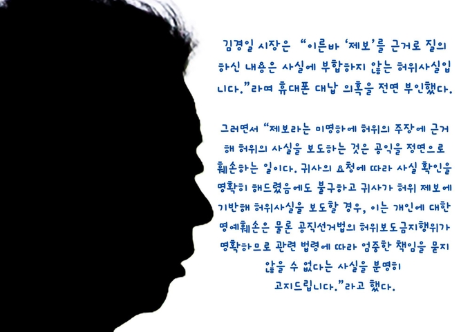 김경일 파주시장이 건설업자에게 휴대폰 대납을 받았다는 공익제보와 관련 파주바른신문은 사실관계 파악을 위해 취재질문지를 비서실을 통해 전달했다. 이에 대해 김경일 시장은 2월 17일 ‘허위사실’이라는 답장을 보내왔다. 파주바른신문은 2월 27일 취재수첩을 통해 예고한 대로 김경일 시장의 입장을 아래와 같이 보도한다.