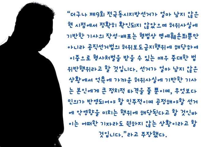 “더구나 제9회 전국동시지방선거가 얼마 남지 않은 현 시점에서 정확히 확인되지 않았으며 허위사실에 기반한 기사의 작성·배포는 형법상 명예훼손죄뿐만 아니라 공직선거법의 허위보도금지행위에 해당하여 이중으로 형사처벌을 받을 수 있는 매우 중대한 법 위반행위라고 할 것입니다. 선거가 얼마 남지 않은 상황에서 억측에 가까운 허위사실에 기반한 기사는 본인에게 큰 정치적 타격을 줄 뿐이며, 무엇보다 민의가 반영되어야 할 민주적이며 공정해야 할 선거에 악영향을 미치는 행위에 해당된다고 할 것인 바 이는 어떠한 기자라도 원하지 않는 상황이라고 할 것입니다.”