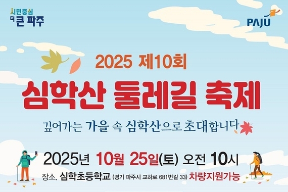 파주시 교하동 주민자치회는 오는 25일 10시, 심학초등학교에서 ‘2025년 제10회 심학산 둘레길 축제’를 개최한다고 밝혔다. ‘깊어가는 가을 속 심학산으로 초대합니다’를 주제로 열리는 이번 행사는 가족이 함께 걷고 즐기는 가을맞이 지역 축제로, 심학산의 아름다운 둘레길을 배경으로 다양한 프로그램이 진행될 예정이다. 이날 축제는 오전 10시 식전 공연을 시작으로, 11시 개막식이 진행된다. 축제 현장에는 체험공간, 먹거리 장터, 농산물 직거래 장터, 풍자화(캐리커처) 무료 체험(선착순 30명) 등 풍성한 볼거리와 즐길 거리가 마련된다. 또한 경품 추첨과 노래자랑 등 참여형 행사도 진행되며, 75인치 발광다이오드(LED) 텔레비전 등 푸짐한 경품이 준비돼 있다. 특히 올해 축제에는 파주시 홍보대사이자 초대가수 김대훈이 출연해 신나는 무대를 선보일 예정이다. 박용호 교하동 주민자치회장은 “올해로 10회를 맞은 심학산 둘레길 축제는 주민이 주도하는 교하동의 대표 축제로 자리 잡았다”라며 “마을회관에서 행사장까지 차량 지원을 제공하는 등 많은 주민들이 불편 없이 참여할 수 있도록 철저히 준비하고 있다”라고 밝혔다.