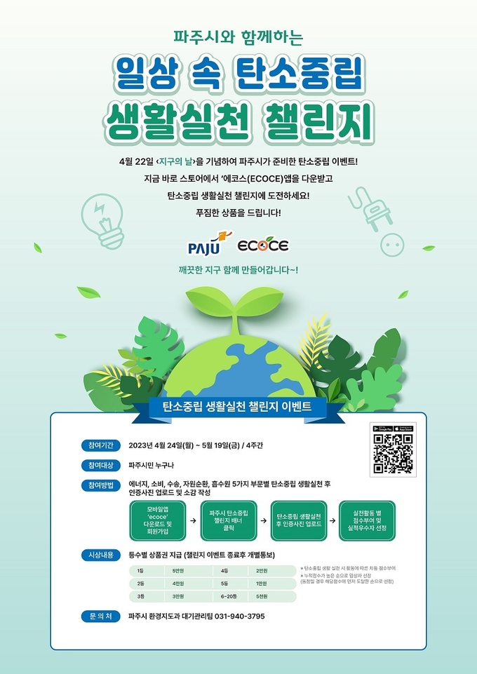 이어 탄소절감 실천 문화 조성을 위해 파주시민 누구나 참여할 수 있는 ‘탄소중립 생활 실천 챌린지’를 4월 24일부터 5월 19일까지 진행한다.