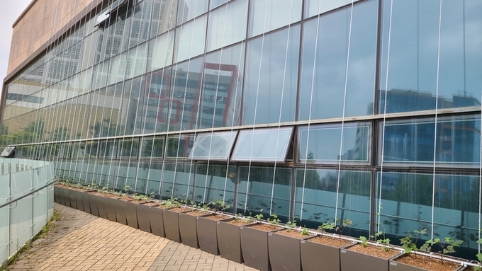 파주시가 가람도서관과 조리도서관 건물 외벽에 20m 길이의 그린커튼을 설치했다.