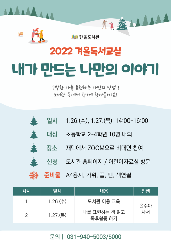 파주시 한울도서관이 초등 2~4학년을 대상으로 ‘내가 만드는 나만의 이야기’ 겨울독서교실을 운영한다.
