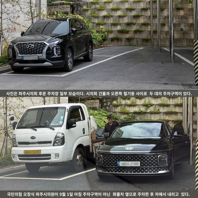 그리고 화물차가 주차한 곳은 앞뒤 일렬로 두 대를 주차할 수 있게 돼 있다. 뒤쪽에 주차하거나 주차한 차량이 먼저 이동하려면 진출입 공간으로 활용되고 있는 쇠기둥 쪽을 이용해야 한다. 그런데 오창식 의원처럼 그 진출입로를 차량으로 막아버리면 자유롭게 이동할 수 없게 된다. 파주시의회 사무국은 시의원들이 주차를 할 수 있도록 회기 때는 청사와 조금 떨어진 지점에 주차금지 라바콘을 각각 세워 편의를 제공한다. 오창식 의원이 무단 주차한 곳은 청사 출입문과 가장 가까운 곳이다. 파주시민을 대변하는 시의원의 자세를 다시 한번 촉구한다.