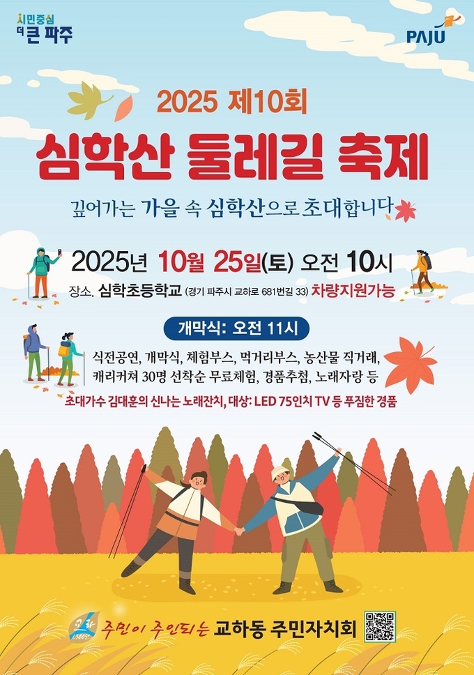 파주시 교하동 주민자치회는 오는 2510, 심학초등학교에서 ‘2025년 제10회 심학산 둘레길 축제를 개최한다고 밝혔다.
