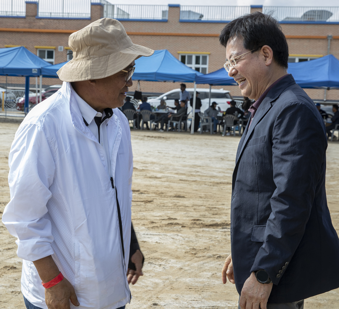 사진은 이재홍 전 파주시장이 지난 19일 파평면 늘노리 용연초등학교 총동문회 한마음 축제장 기수별 천막을 찾아가 참가자들에게 명함을 건네며 인사하는 모습이다. 이 전 시장이 돌린 명함에는 국민의힘 중앙위원회 행정자치분과위 이재홍 위원장으로 돼 있다. 뒷면에는 도시공학 박사, 봉사단체 파주아카데미 고문, 민선6기 파주시장, 행정중심복합도시건설청장, 대통령실 국토해양비서관, 국토해양부 기획조정실장 등의 경력이 쓰여 있다.