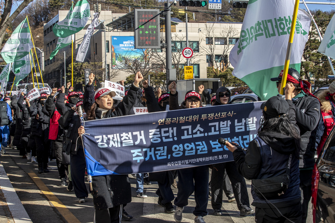 자작나무회 회원 콩심 씨도 발언에서 “대추벌에서 20년간 일하며 가족을 부양했다. 미래에 조금 더 나은 삶을 살기 위해 열심히 살았다. 그러던 어느 날 청천벽력 같은 일이 생겼다. 김경일 시장이 나의 삶의 터전을 없애겠다는 것이었다. 이곳 대추벌은 주택재개발조합 승인을 받은 곳이다. 파주시장은 자신의 업적 쌓기에 혈안이 되어 재개발을 무산시켰다. 우리는 이런 폭력적인 시간 속에서 땅바닥에 무릎 꿇고 살려달라고 애원도 했다. 우리를 정치적 야망을 위해 제물로 삼는 것 아닌가 하는 의심이 들 정도다. 우리는 이제 물러설 곳이 없다. 파주시청에 뼈를 묻을 각오로 투쟁할 것을 선포한다.”라고 말했다.