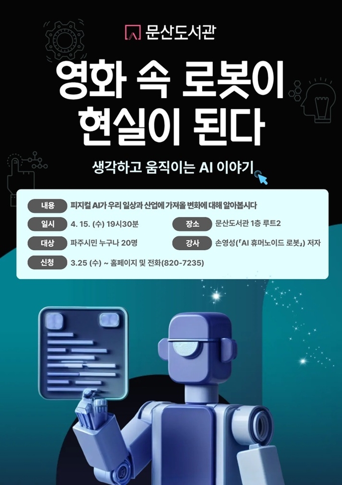 파주시 문산도서관은 오는 4월 15일 19시 30분, 과학기술 강연 ‘영화 속 로봇이 현실이 된다: 생각하고 움직이는 인공지능(AI) 이야기’를 개최한다.