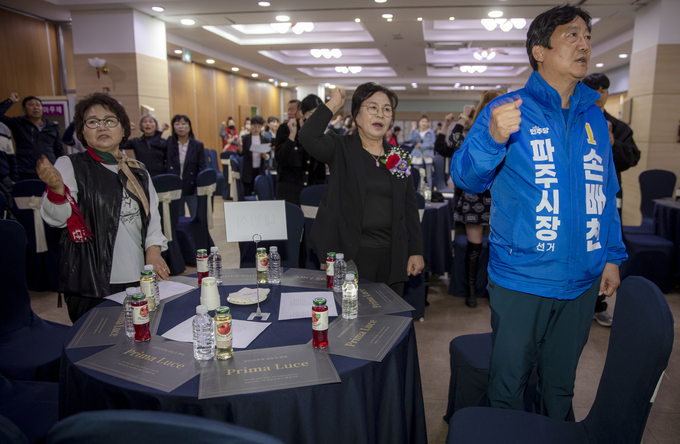 사진은 파주시의회 의장 출신인 손배찬 파주시장 예비후보가 지난 4월 초 문산 프리마루체 연회장에서 열린 이계순의 『나는 포주다』 출판기념회에 참석해 대추벌 성노동자들과 함께 ‘임을 위한 행진곡’ 등 투쟁가를 부르고 있는 모습이다. 이 노래는 재야운동가 백기완 선생이 쓴 시를 바탕으로 소설가 황석영이 작사했고, 민주화운동에 참여했던 전남대학교 학생 김종률이 희생자 윤상원과 박기순의 영혼 결혼식을 위해 작곡한 5•18 민주화운동을 상징하는 민중가요이다.
